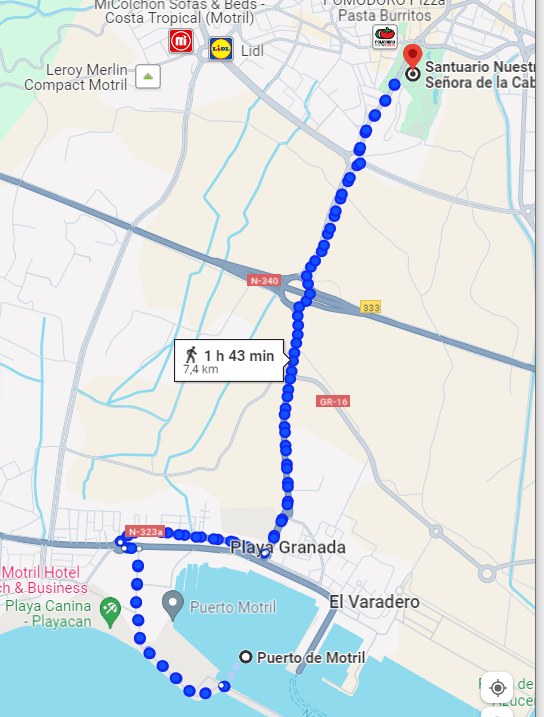- Oficina de turismo C. Cercado de la Virgen hacia Av. de la Constitución. Giramos a la izquierda hacia Av. de la Constitución y caminamos todas la Av. Ntra. Sra. de la Cabeza hasta llegar a Carrera del Mar (Puerto), giramos a la izquierda hacia Av. Julio Moreno hasta llegar a Varadero. A continuación, nos dirigimos por el polígono de mercancías (Puerto) y saldremos de nuevo a Av. Ntra. Sra. de la Cabeza, subiremos la “cuesta de la playa”, hasta llegar a Santuario de nuestra señora Virgen de la Cabeza, Fin del recorrido